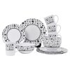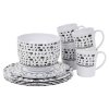 Sada je vhodná pro 4 osoby a skládá se ze 4 jídelních talířů (Ø 25 cm), 4 snídaňových talířů (Ø 20 cm), 4 misek (Ø 15 cm) a 4 hrnků (Ø 8 cm). Nádobí je odolné proti poškrábání a lze jej mýt v myčce při nízké teplotě.